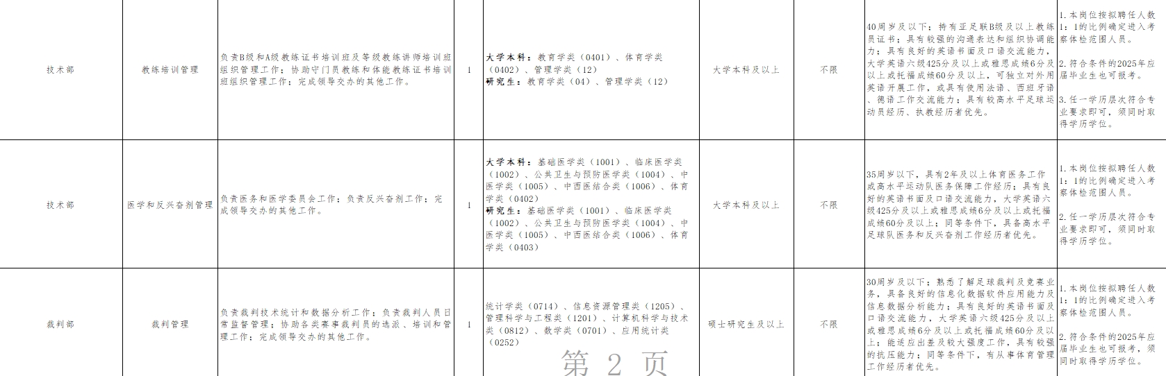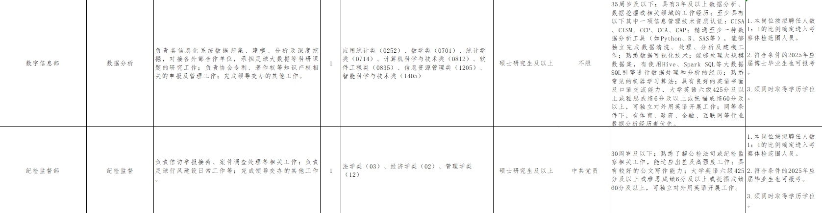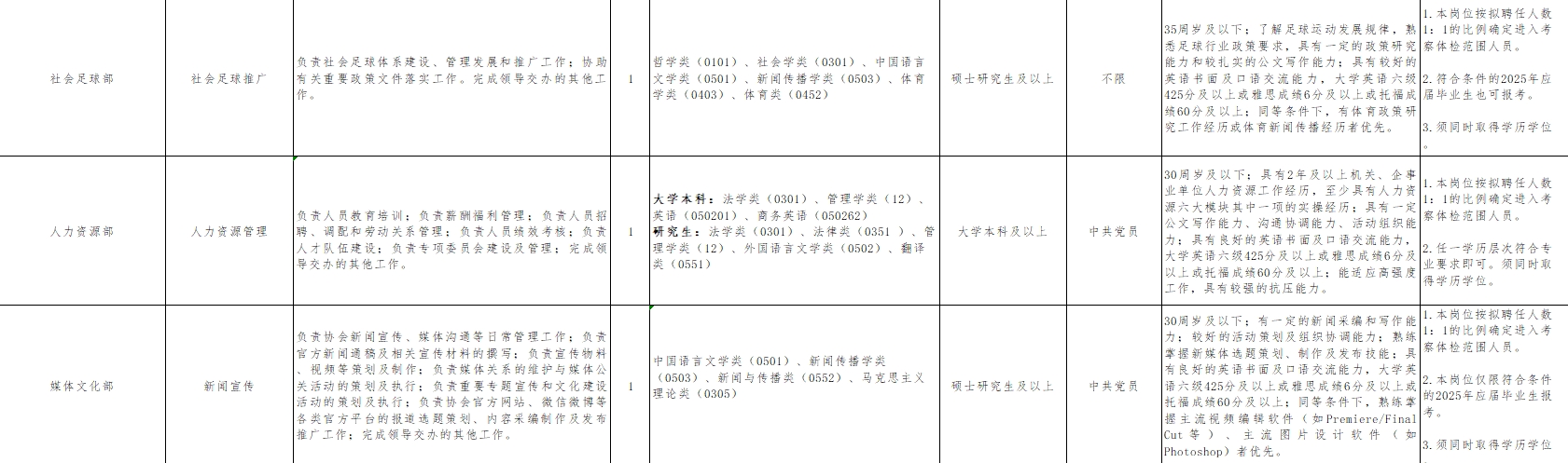 另外,綜合部(財(cái)務(wù)審核)、國家隊(duì)管理部(隊(duì)伍管理)、裁判部(裁判管理)、社會(huì)足球部(社會(huì)足球推廣)、媒體文化部(新聞宣傳)、數(shù)字信息部(數(shù)據(jù)分析)、紀(jì)檢監(jiān)督部(紀(jì)檢監(jiān)督)要求學(xué)歷為碩士研究生及以上,其余崗位為大學(xué)本科及以上。