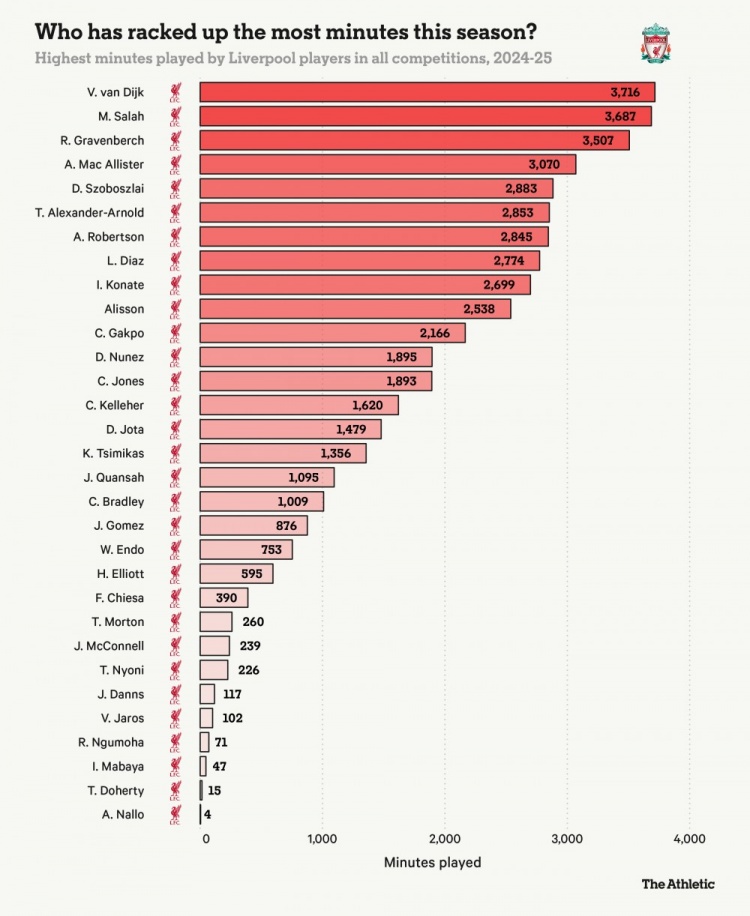 從時(shí)間分布看差異更明顯:2023-24賽季有10人出場(chǎng)時(shí)間在2000-3000分鐘區(qū)間。而按照現(xiàn)有趨勢(shì)推算,本賽季利物浦最多僅有6人處于該區(qū)間(其中還包括了替補(bǔ)門(mén)將凱萊赫和左后衛(wèi)齊米卡斯)。