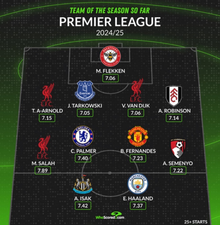 3月19日訊 數(shù)據(jù)網(wǎng)站W(wǎng)hoscored盤點(diǎn)了本賽季英超至今場(chǎng)均評(píng)分最高的11人陣容(至少25次首發(fā)),其中薩拉赫、哈蘭德、B費(fèi)等人在列,具體陣容如下: