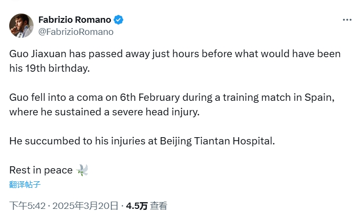 03月20日訊 18歲的國安青訓(xùn)小將郭嘉璇昨日去世, 羅馬諾在社媒發(fā)文表示哀悼。