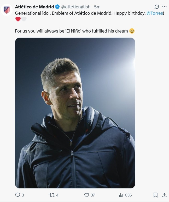 3月20日訊 今天是費爾南多-托雷斯的41歲生日,馬競官方更新動態(tài)向他表示了祝賀。馬競官方表示道:“一代偶像,馬競的象征,生日快樂托雷斯!??????對我們來說,你永遠是已經(jīng)實現(xiàn)夢想的圣嬰?????!?/p>托雷斯目前是馬競B隊的主教練,球員時期托雷斯為馬競出場403次,打進129粒進球。 本文標簽: 足球 西甲 馬德里競技
