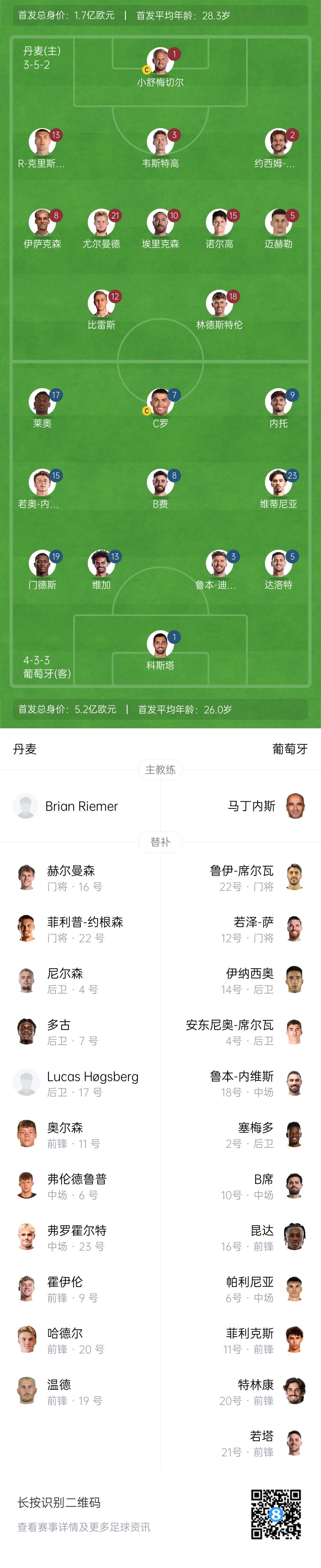 3月21日訊 北京時間03:45,歐國聯(lián)1/4賽決賽首回合,葡萄牙客場挑戰(zhàn)丹麥。賽前官方公布了雙方的首發(fā)名單。