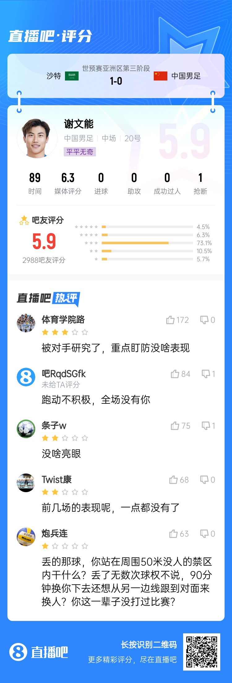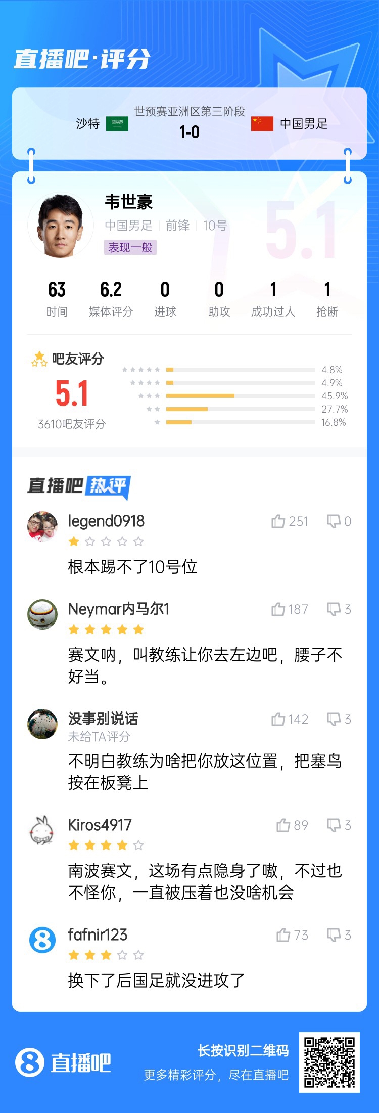 18強賽關鍵戰(zhàn),國足0-1不敵沙特,沒能擺脫小組墊底。吧友評分中,國足中場球員普遍低分,韋世豪5.1分,王上源2.2分,曹永競2.8分,王上源2.2分。 本文標簽: 足球 中超 中國足球 中國男足