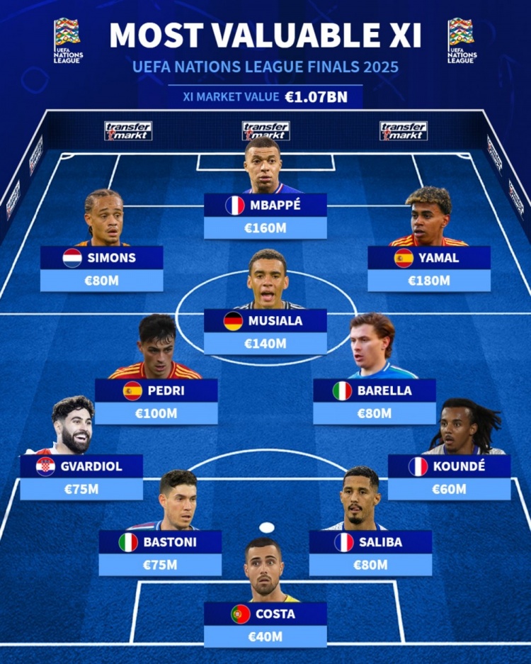 歐國(guó)聯(lián)1/4決賽最貴陣容(德轉(zhuǎn)總價(jià)10.7億歐)