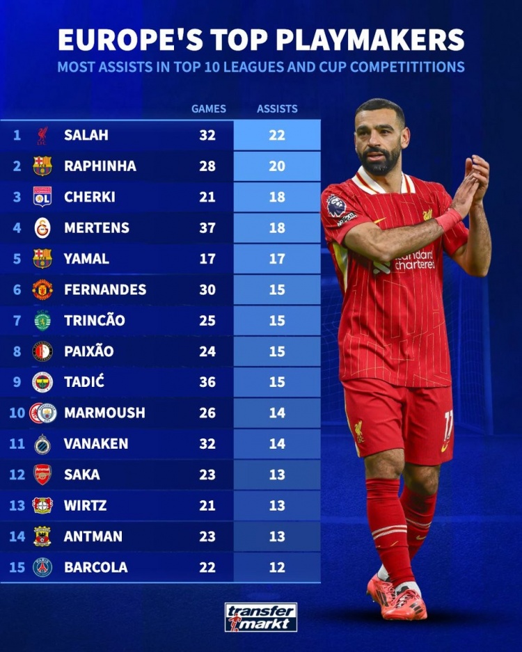 3月21日訊 國家隊比賽周到來,轉會市場也統計了本賽季歐洲前十聯賽俱樂部的球員助攻情況,薩拉赫壓拉菲尼亞居首。
