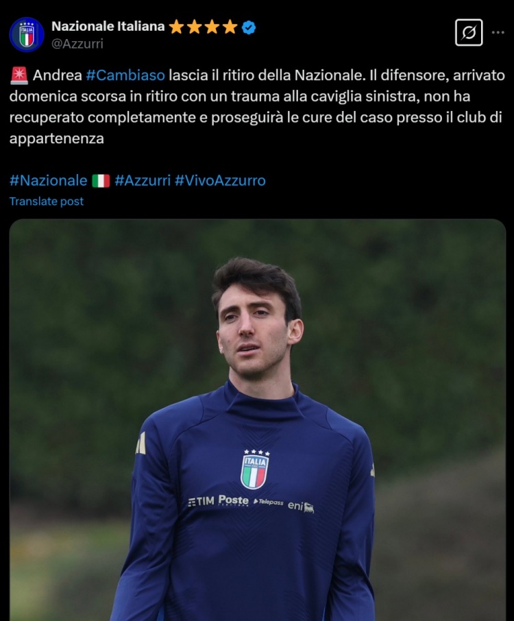 意大利隊官方:坎比亞索因左腳踝傷勢退出本期國家隊,將返回尤文