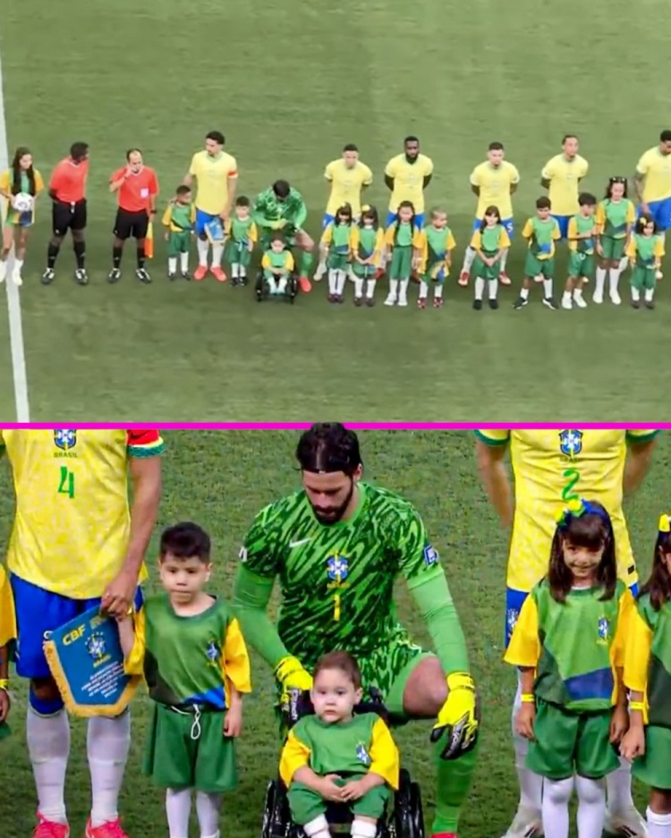 此役阿利森擔(dān)任巴西隊(duì)首發(fā)門將,他在賽前列隊(duì)奏國(guó)歌時(shí)單膝跪地,以照顧身前坐輪椅的球童,避免身高差太大。