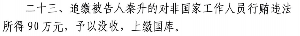二十三、追繳被告人秦升的對(duì)非國(guó)家工作人員行賄違法所得90萬元,予以沒收,上繳國(guó)庫。