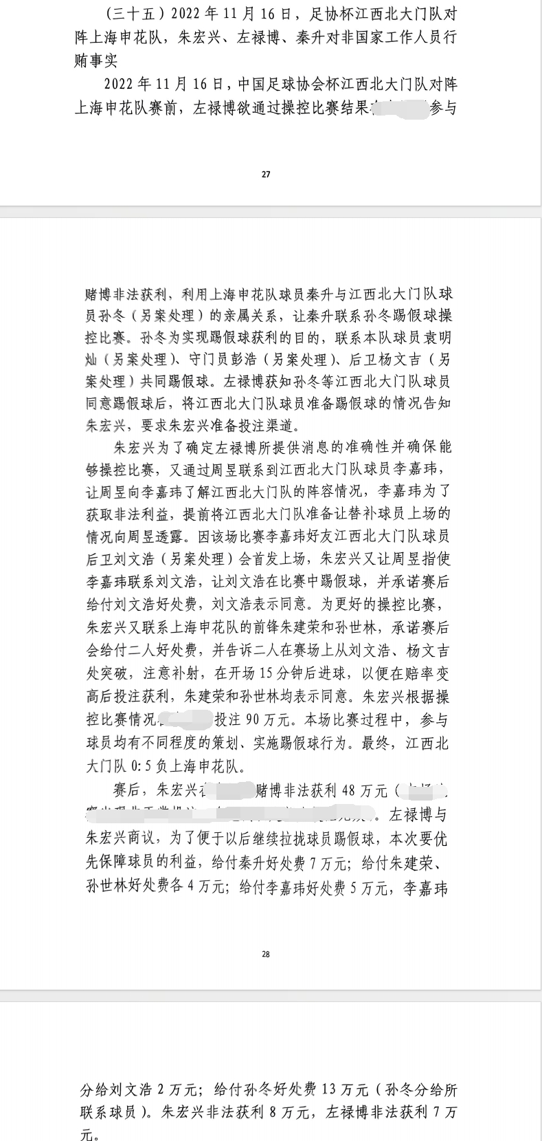 2022年11月16日,足協(xié)杯江西北大門(mén)隊(duì)對(duì)陣上海申花隊(duì)、朱宏興、左祿博、秦升對(duì)非國(guó)家工作人員行賄事實(shí)