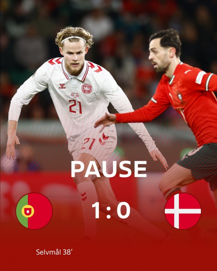 3月24日訊 北京時間3月24日03:45,歐國聯(lián)八強戰(zhàn)次回合葡萄牙迎戰(zhàn)丹麥的比賽在阿爾瓦拉德球場進行,上半場C羅開場造點+點射被撲,達洛特頭球造險,B費角球造安德森解圍自擺烏龍,半場結(jié)束,葡萄牙1-0丹麥。