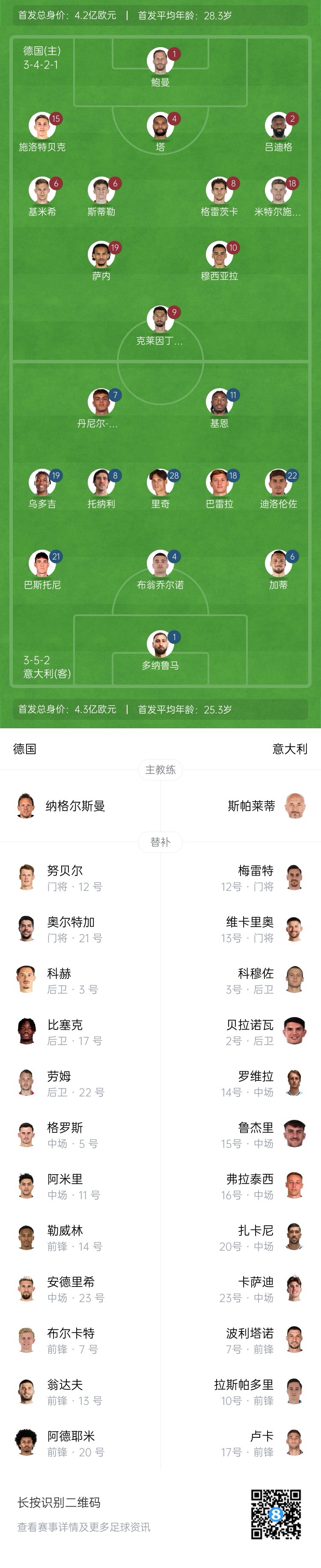 3月24日訊 歐國(guó)聯(lián)1/4決賽次回合,德國(guó)vs意大利首發(fā)出爐。陣容更新中。首回合對(duì)陣,德國(guó)2-1意大利。