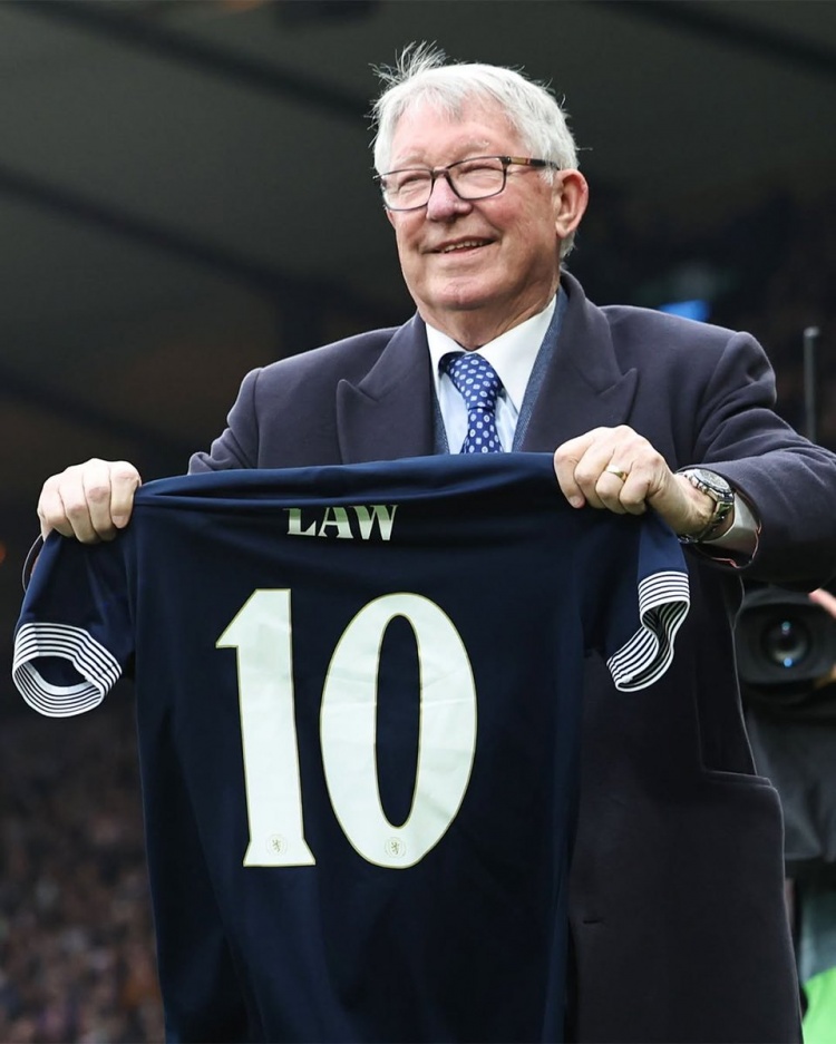 3月24日訊 當(dāng)?shù)貢r(shí)間上周末蘇格蘭對陣希臘的歐國聯(lián)賽前,弗格森手持丹尼斯-勞蘇格蘭隊(duì)10號球衣,向其致以敬意。