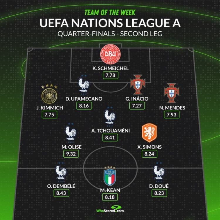 3月24日訊 歐國聯(lián)八強(qiáng)戰(zhàn)次回合已經(jīng)完賽,whoscored也統(tǒng)計(jì)了本輪評分最佳陣容,法國隊(duì)5將在列。
