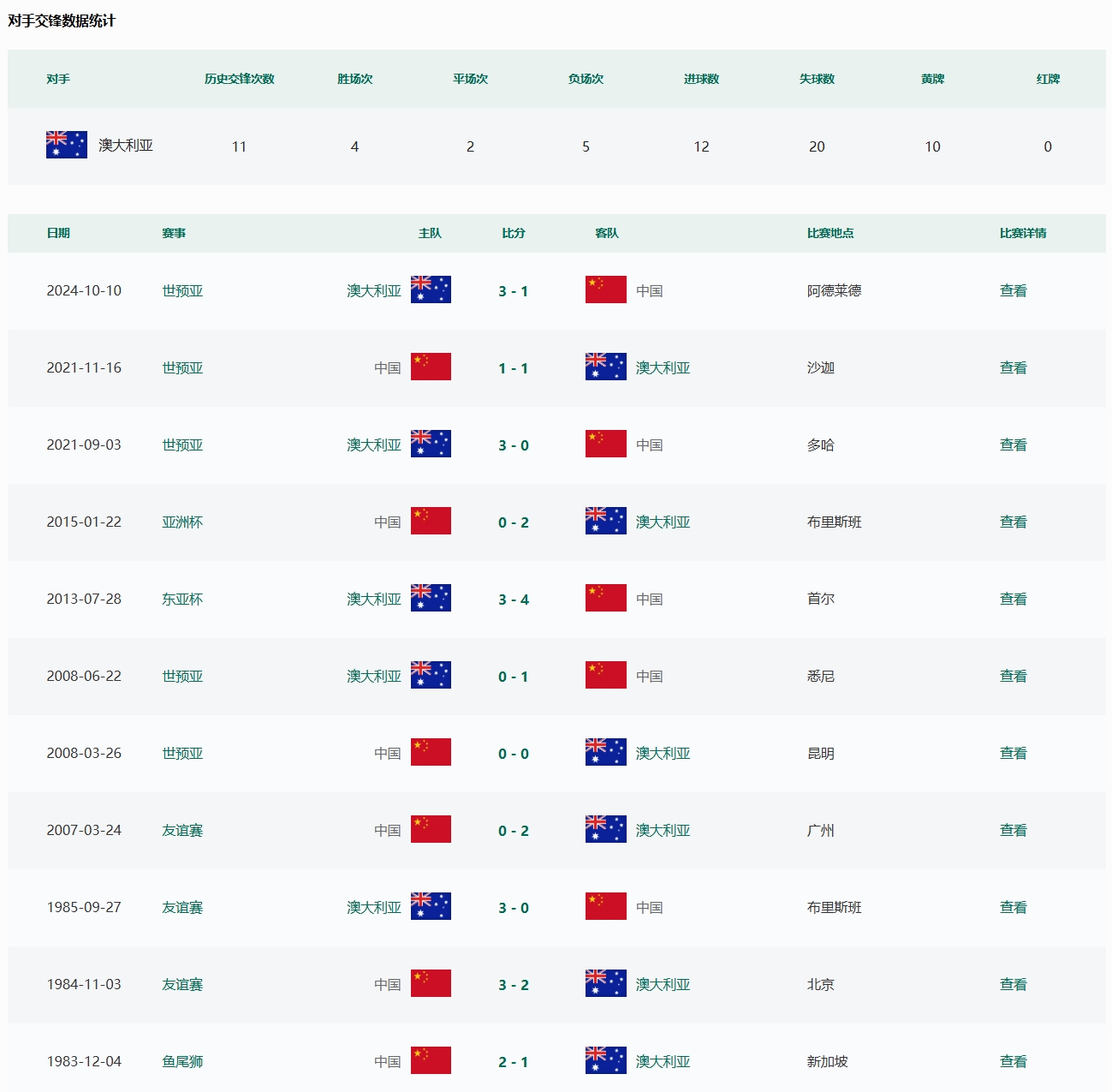 根據(jù)中國足協(xié)官網(wǎng)數(shù)據(jù)顯示,國足此前共11次交手澳大利亞,取得4勝2平5負的戰(zhàn)績。