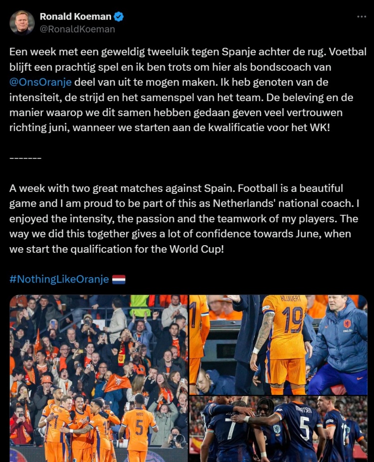3月25日訊 荷蘭在歐國(guó)聯(lián)八強(qiáng)戰(zhàn)經(jīng)歷點(diǎn)球大戰(zhàn)不敵西班牙,主帥科曼在今日通過社媒發(fā)文。