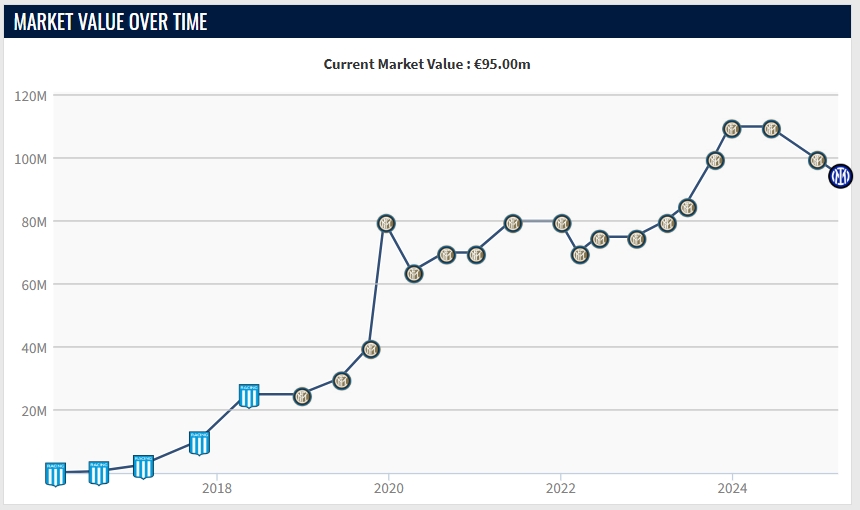 本賽季,勞塔羅為國(guó)米出場(chǎng)39次,打進(jìn)18球、助攻6次。勞塔羅歷史最高身價(jià)曾到達(dá)1.1億歐元。