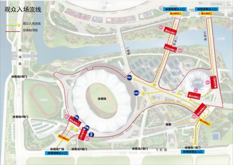 抵達(dá)現(xiàn)場的觀眾,可經(jīng)由 1 號(hào)門、西廣場、2 號(hào)橋以及 3 號(hào)橋前往體育場入口,有序入場。建議龍之隊(duì)、長城、中國制躁等有組織的球迷通過3號(hào)橋?qū)S猛ǖ赖竭_(dá)安檢口。