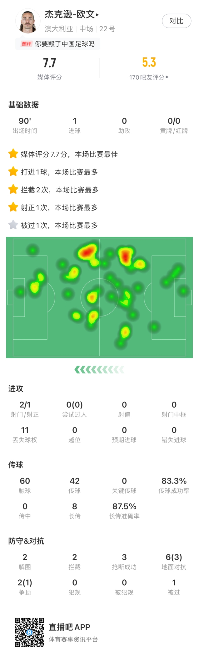 03月25日訊 世預(yù)賽亞洲區(qū)18強(qiáng)賽C組第8輪,國(guó)足主場(chǎng)0-2輸給澳大利亞,賽后杰克遜-歐文當(dāng)選全場(chǎng)最佳!歐文為澳大利亞打入了第一粒進(jìn)球: