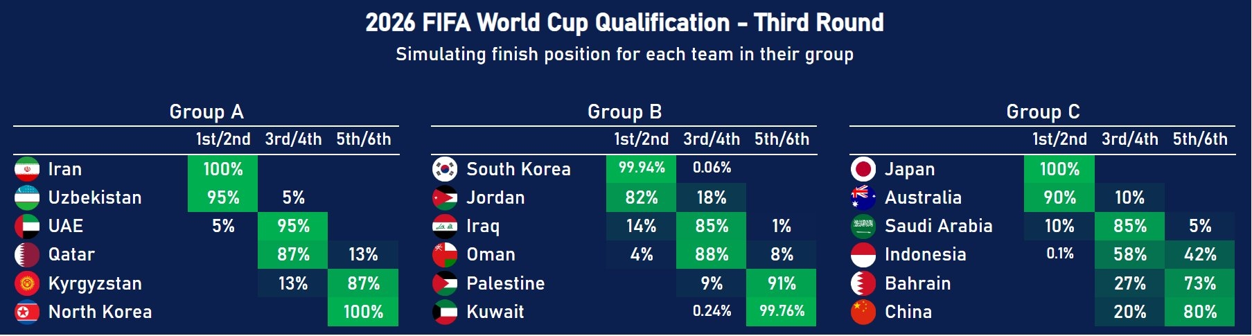 03月26日訊 數(shù)據(jù)機(jī)構(gòu)Footy Rankings發(fā)布世預(yù)賽預(yù)測。其中中國隊20%排3/4(附加賽),80%排在5/6(無緣世界杯),而印尼58%概率獲得附加賽資格。 本文標(biāo)簽: 足球 中國男足 中國足球 中超
