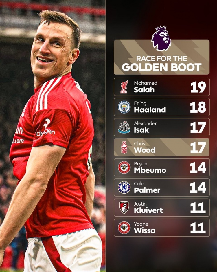 17球,伊薩克(紐卡)、克里斯-伍德(諾丁漢森林)