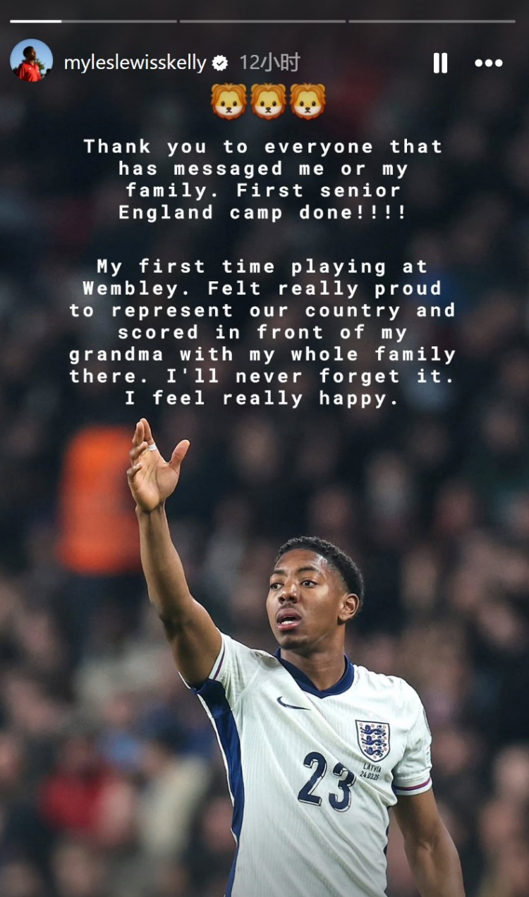 斯凱利寫道:“感謝所有為我和我的家人送上問候的人,首次英格蘭一線隊之旅結(jié)束了?。?!這是我第一次在溫布利球場踢球。能為國出戰(zhàn),并在奶奶和全家面前進球,我倍感驕傲。我永遠(yuǎn)不會忘記,也感到非常開心?!?/p>