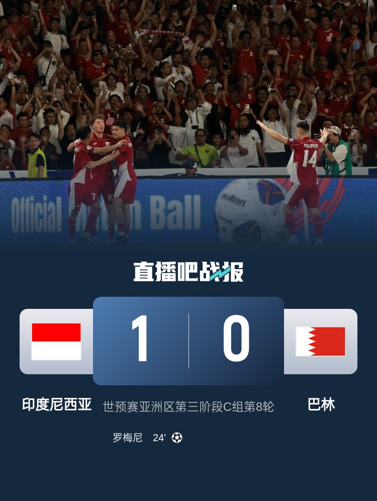 3月26日訊 18強(qiáng)賽C組第8輪,印尼隊(duì)主場1-0擊敗巴林隊(duì),以9個(gè)積分暫居C組第4,繼續(xù)追趕身前的沙特和澳大利亞。