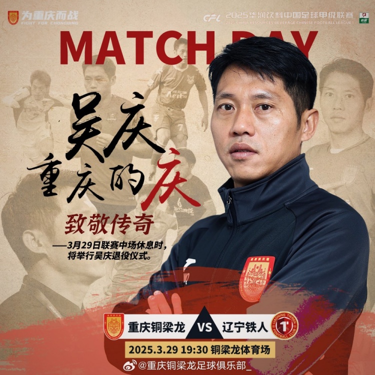 3月26日訊 3月29日晚,中甲聯(lián)賽第2輪重慶銅梁龍將在主場(chǎng)對(duì)陣遼寧鐵人。重慶銅梁龍俱樂(lè)部官方宣布,將在本場(chǎng)比賽中場(chǎng)休息時(shí)舉行吳慶退役儀式,向傳奇致敬。