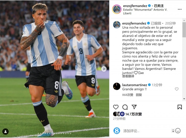 “永遠(yuǎn)感激球迷們對(duì)我們的支持,很高興經(jīng)歷一個(gè)將被永遠(yuǎn)銘記的夜晚。讓我們?yōu)榻酉聛淼奶魬?zhàn)將繼續(xù)努力!加油,兄弟們!加油,阿根廷!永遠(yuǎn)團(tuán)結(jié)一致!”