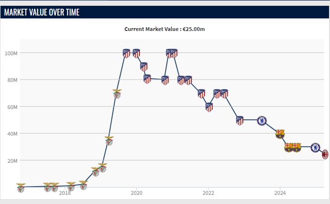 菲利克斯2500萬(wàn)歐的身價(jià)也是2019年之后的新低,菲利克斯2019年巔峰身價(jià)曾達(dá)1億歐,在2021年之后身價(jià)一直在下降。