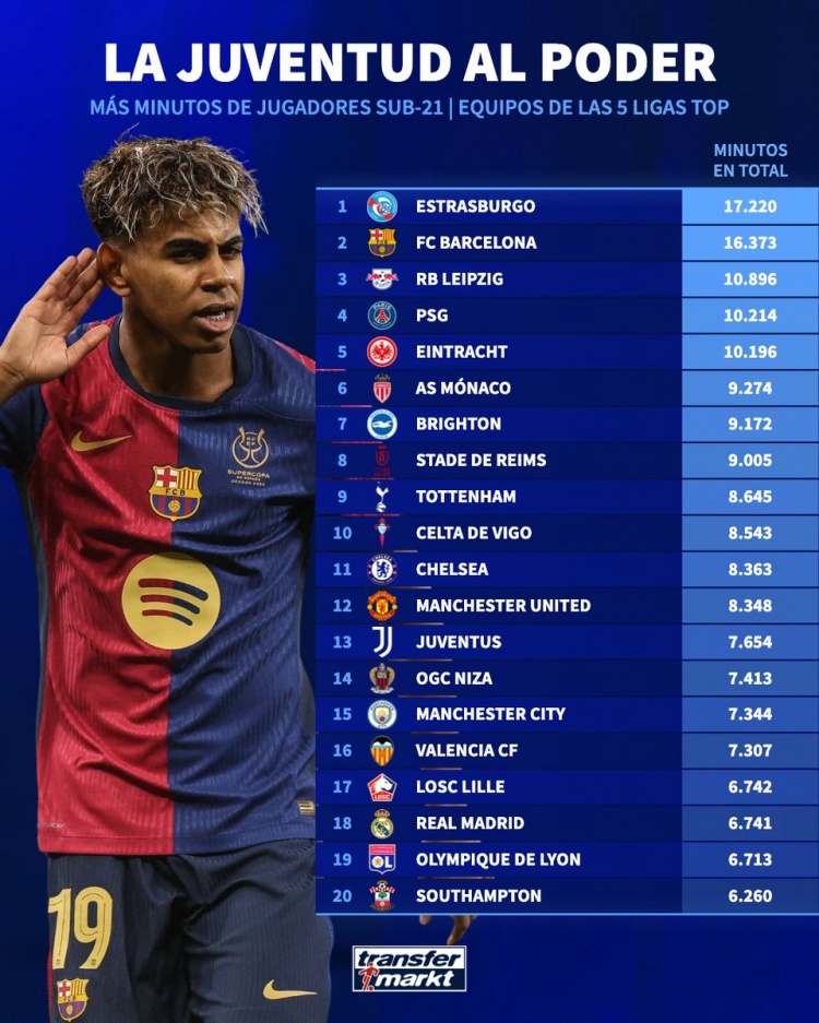 3月27日訊 德國轉會市場統(tǒng)計了本賽季五大聯(lián)賽球隊U21球員的總出場時間,并列出榜單,斯特拉斯堡居首,巴塞羅那、萊比錫排名二三位。