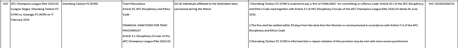1.山東泰山對陣光州FC時有6人染黃,因違反亞足聯(lián)紀(jì)律與道德準(zhǔn)則第53.1條以及亞足聯(lián)亞冠精英聯(lián)賽紀(jì)律通告第3.1條,被罰款6000美元。