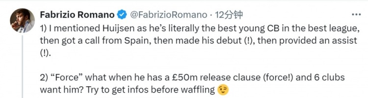 羅馬諾回復(fù)道:“第一,我提到懷森是因?yàn)樗_實(shí)是最佳聯(lián)賽中最為出色的年輕中衛(wèi),他得到西班牙隊(duì)的征召,然后上演了國家隊(duì)的首秀,并送出助攻?!?/p>
