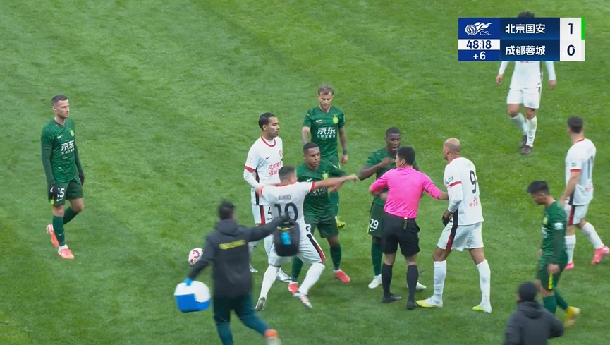 03月29日訊 中超第3輪,北京國安vs成都蓉城。比賽上半場補時階段,費利佩倒地時踩到恩加德烏腹部,兩隊爆發(fā)沖突,馬寧趕緊拉開兩方球員。場上比分國安1-0蓉城。 本文標簽: 足球 中超 中國足球 成都蓉城 北京國安