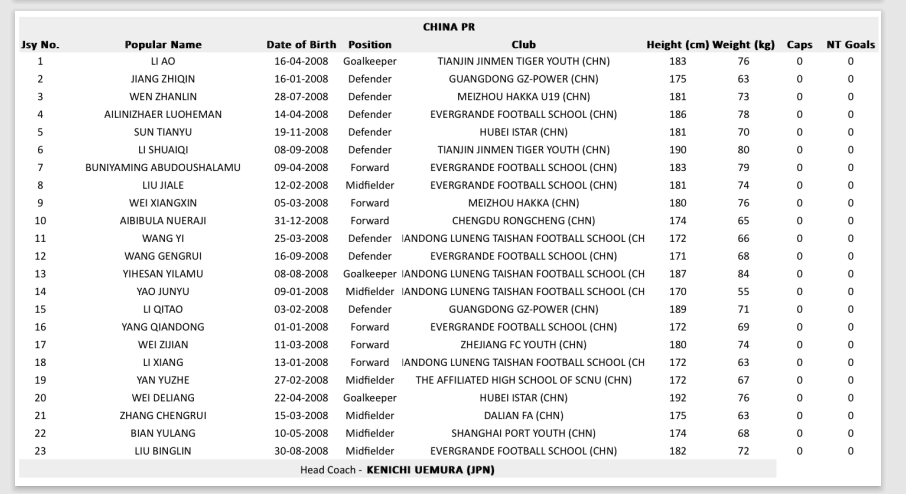 03月29日訊 亞足聯(lián)官方公布U17亞洲杯各隊(duì)23人名單,中國(guó)隊(duì)名單中艾比布拉領(lǐng)銜,魏祥鑫、布尼亞明在列。這支U17國(guó)足由上村健一掛帥,球隊(duì)近期共踢了4場(chǎng)熱身賽,均失利。