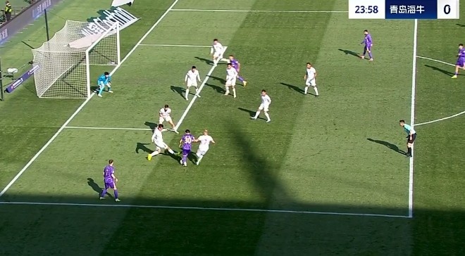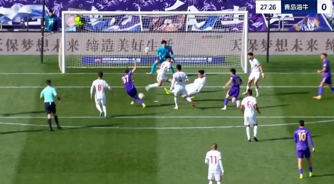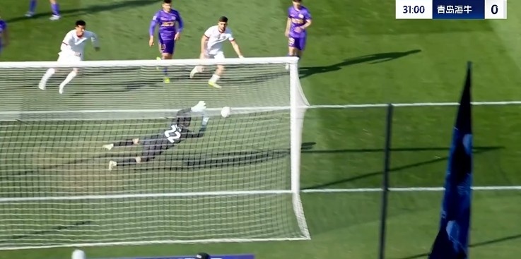 第31分鐘,青島海牛禁區(qū)里一次頭球攻門(mén)被門(mén)將飛身?yè)涑龅拙€。↓