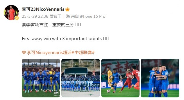 3月29日訊 北京時間今晚結束的中超第3輪,上海申花3-1逆轉河南隊,開局2勝1平積7分。賽后,申花球員李可更新社交媒體,曬出了比賽圖片。李可用中英文寫道:“賽季客場首勝,重要的三分!”本場比賽,李可和吳曦搭檔雙中場,并打滿了全場,此前李可也入選了3月份的國家隊名單。 本文標簽: 足球 中超 中國足球 上海申花
