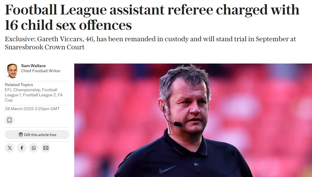 03月29日訊 電訊報(bào)獨(dú)家消息,46歲的英國裁判被指控16項(xiàng)兒童性犯罪,目前已被羈押,他將于今年9月受審。