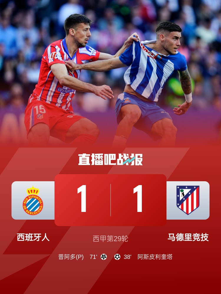 西甲第29輪,馬競(jìng)客場(chǎng)1-1西班牙人。上半場(chǎng),勒諾爾芒傷退,阿斯皮利奎塔凌空無(wú)解世界波;下半場(chǎng),朗格萊魯莽拉人送點(diǎn),普阿多點(diǎn)射扳平。
