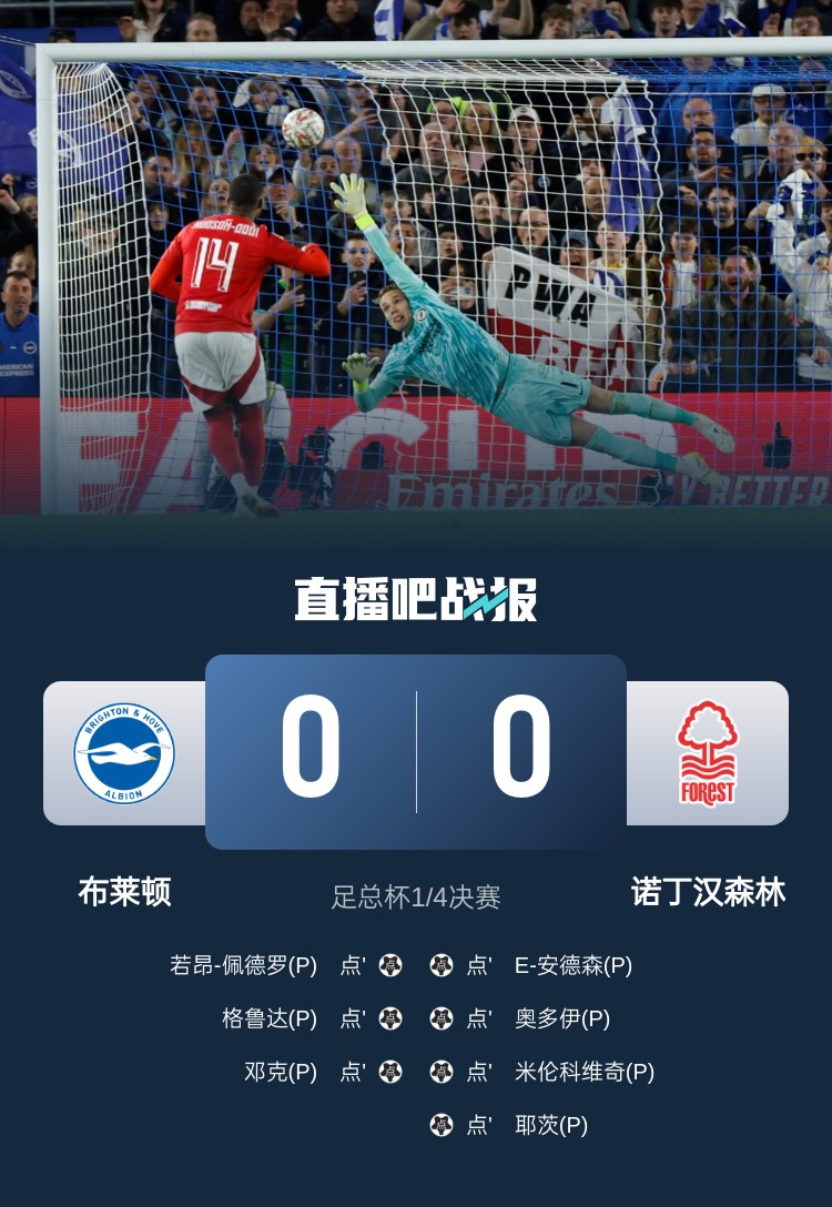 足總杯-布萊頓點(diǎn)球大戰(zhàn)3-4諾丁漢森林遭淘汰 塞爾斯兩撲點(diǎn)
