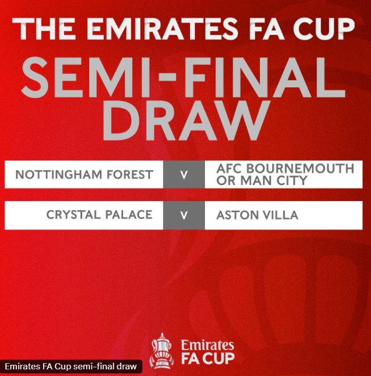 3月30日訊 足總杯1/4決賽結束三場較量,維拉、諾丁漢森林、水晶宮晉級,曼城與伯恩茅斯比賽即將開始。足總杯官方公布了半決賽抽簽結果,具體如下:諾丁漢森林vs曼城&伯恩茅斯比賽勝者水晶宮vs阿斯頓維拉本賽季足總杯半決賽將于4月26日以及27日在溫布利大球場進行。 本文標簽: 足球 英超 曼城 阿斯頓維拉