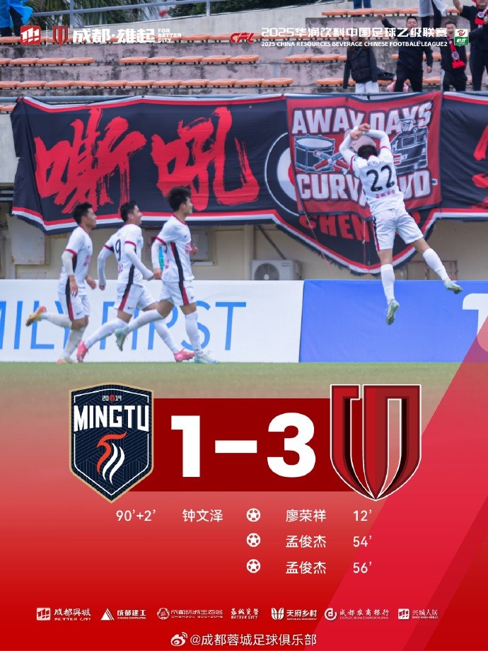 在今天下午進(jìn)行的中乙第2輪成都蓉城B隊與廣東銘途的比賽中,上半場,孟俊杰創(chuàng)造點(diǎn)球機(jī)會,廖榮祥點(diǎn)射破門;下半場,孟俊杰3分鐘內(nèi)梅開二度,廣東銘途補(bǔ)時階段扳回一球。最終,成都蓉城B隊3-1擊敗對手,收獲兩連勝。