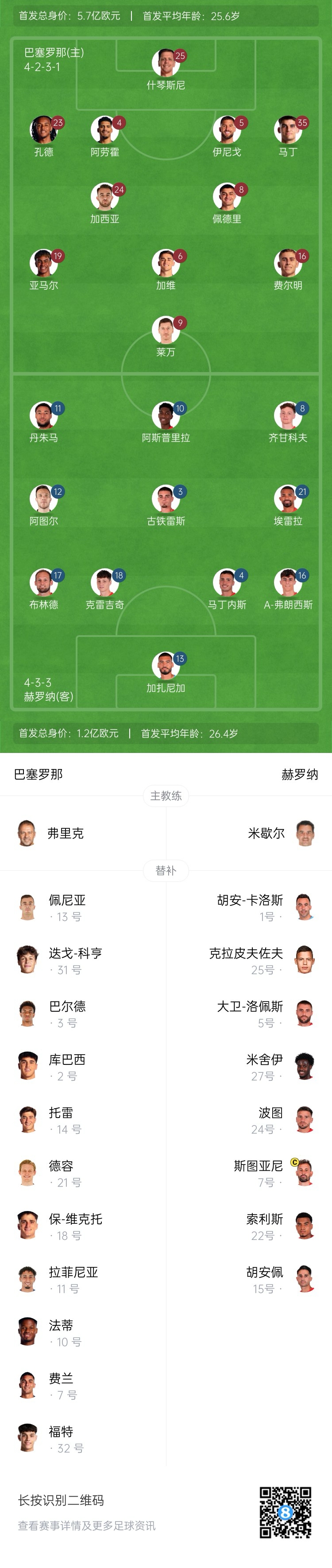巴薩首發(fā):25-什琴斯尼、4-阿勞霍、5-伊尼戈-馬丁內(nèi)斯、23-孔德、24-埃里克-加西亞、35-杰拉德-馬丁、6-加維、8-佩德里、16-費(fèi)爾明、19-亞馬爾、9-萊萬