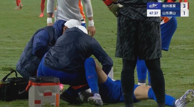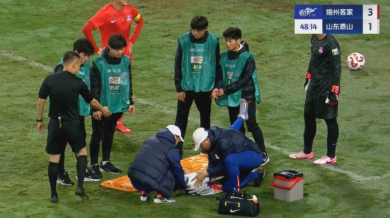 3月29日進(jìn)行的中超第3輪比賽,泰山vs梅州第50分鐘,王彤遠(yuǎn)射后為了躲避封堵失去平衡摔地,隨后被擔(dān)架抬下,張弛替補(bǔ)登場。