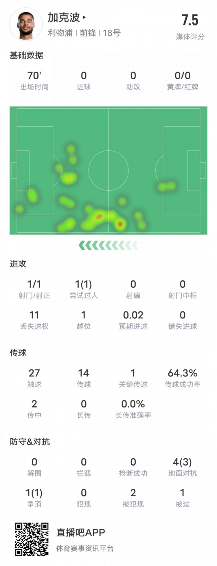 2月2日訊 英超第24輪,利物浦客戰(zhàn)伯恩茅斯,加克波首發(fā)出戰(zhàn),制造1粒點球,1次過人成功,送出1次關(guān)鍵傳球,評分7.5。