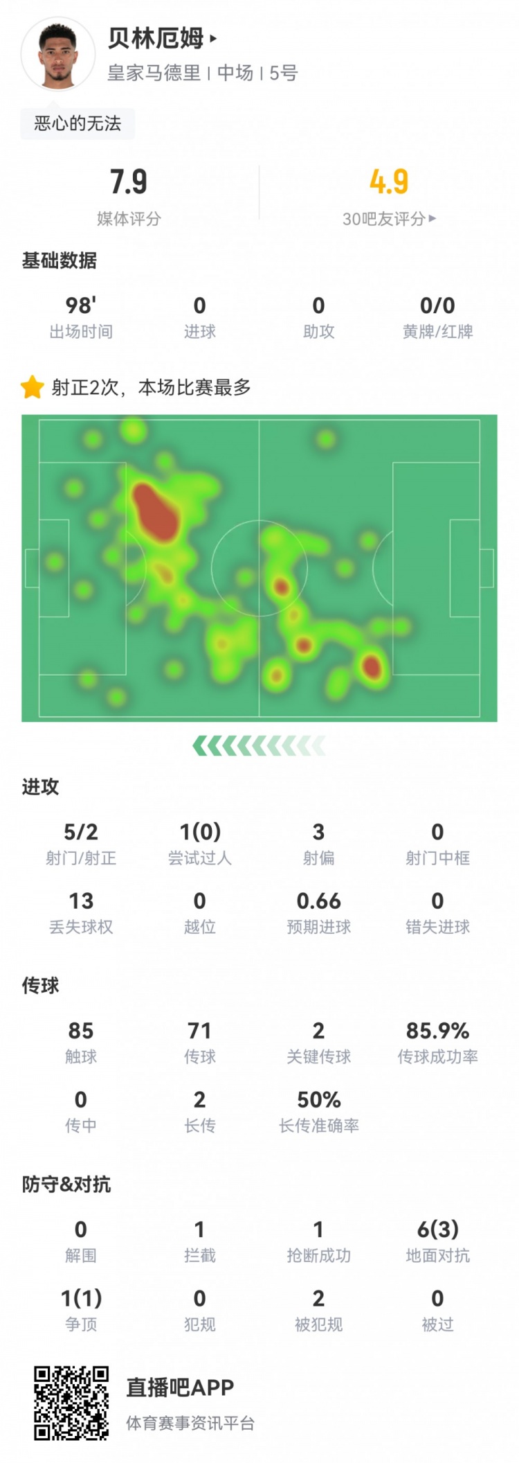 2月2日訊 本輪西甲,皇馬0-1客負西班牙人。此役貝林厄姆首發(fā)打滿全場,球員全場重點數據如下↓5射2正13次丟失球權預期進球0.6685次觸球傳球成功率85.9%2次關鍵傳球7次對抗成功4次評分7.9 本文標簽: 足球 貝林厄姆 西甲 皇家馬德里