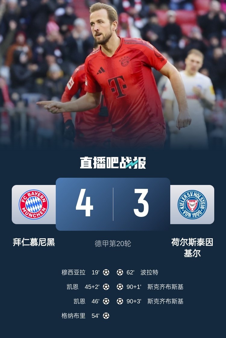 凱恩雙響,拜仁4-3力克基爾迎來德甲6連勝,多賽一場領(lǐng)先第二的勒沃庫森9分。