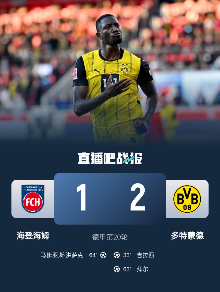 多特客場2-1擊敗海登海姆,結(jié)束4輪不勝。