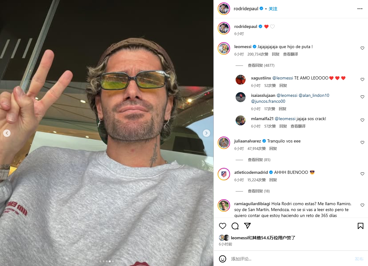 02月02日訊 德保羅今日在ins曬出個人帥照,照片中他在大都會球場身穿寬松運動衫和褲子,戴著墨鏡和帽子。而這位阿根廷國家隊的潮人代表再次遭到了隊友調(diào)侃。梅西在評論區(qū)評論道:“哈哈哈哈,你這狗娘養(yǎng)的。”阿爾瓦雷斯也給德保羅評論道:“你冷靜點。”小西蒙尼也出現(xiàn)在評論區(qū),他寫道:“哎喲,不愧是帥哥啊,媽呀呀呀????????” 本文標簽: 足球 西甲 馬德里競技 梅西 邁阿密國際