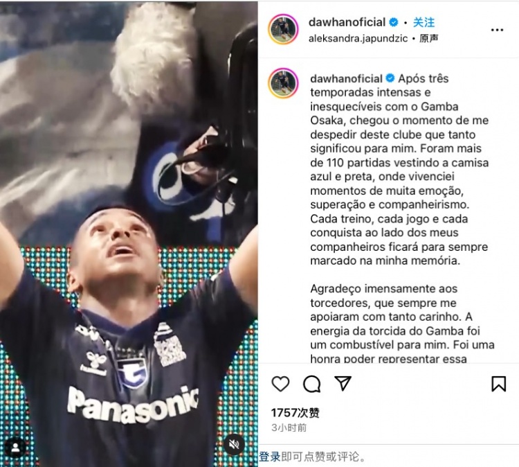 在轉(zhuǎn)會(huì)官宣后,達(dá)萬(wàn)社媒發(fā)布視頻集錦,向大阪鋼巴球迷告別。他寫道: