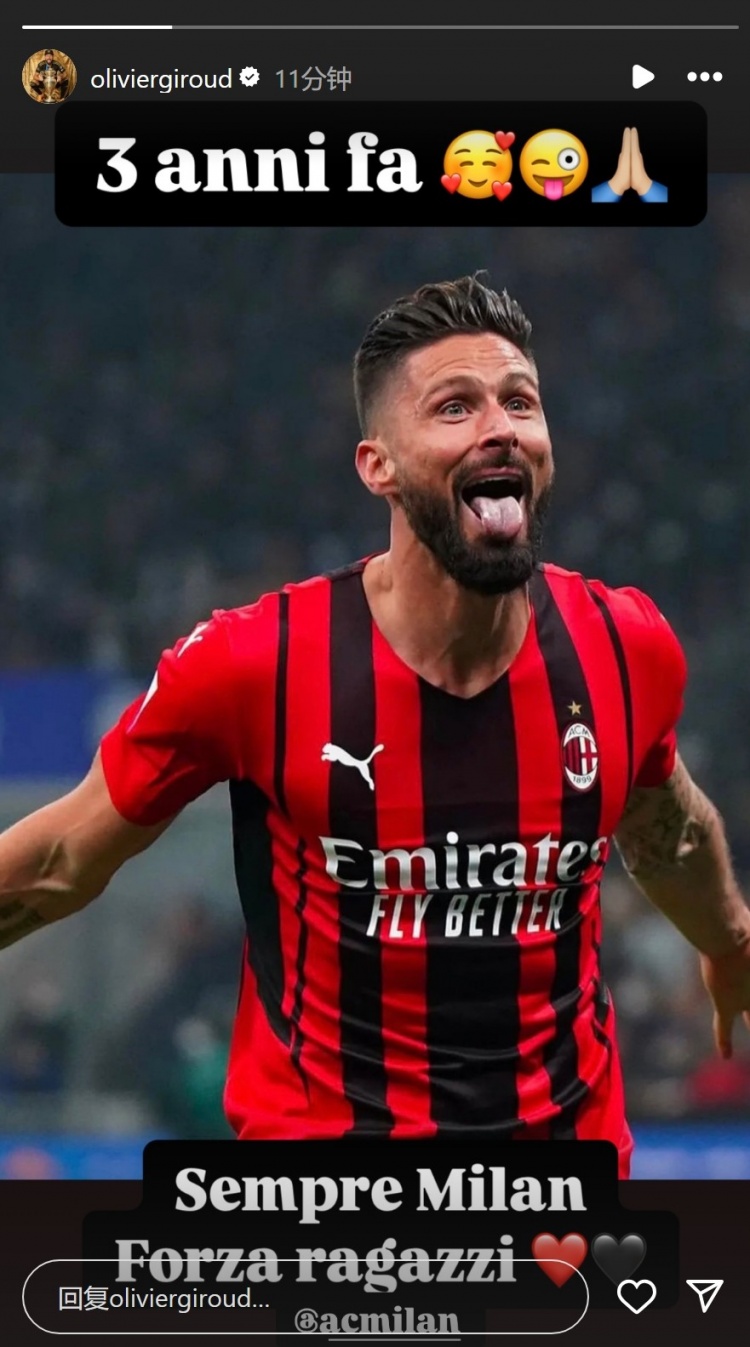 2月2日訊 北京時(shí)間明天凌晨1點(diǎn),米蘭將在意甲第23輪比賽中對(duì)陣國(guó)米。2022年2月5日的米蘭德比中,吉魯為米蘭打進(jìn)2球,幫助球隊(duì)2-1擊敗國(guó)米。吉魯在社交媒體上曬出自己當(dāng)時(shí)慶祝進(jìn)球的照片,配文:“三年前。永恒的米蘭,加油兄弟們!” 本文標(biāo)簽: 足球 意甲 AC米蘭 MLS